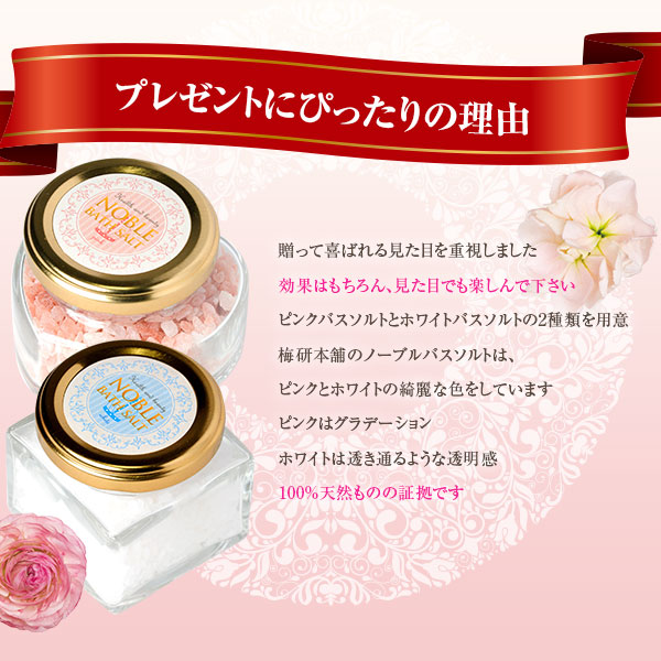 美容や健康を心掛けているあなたの大切な人にプレゼントして欲しくて梅研本舗が今までに無い商品を作りました! 本物の特別なバスソルトで、自宅でかんたん高級エステNOBLE BATH SALT HERB ノーブル・バスソルト・ハーブ 特に!最高級グレードのハーブを独自配合したバスソルトは、他にはなかなかありません。「梅研本舗」の独自商品です NOBLE BATH SALT(ノーブル・バスソルト)とは英語で高貴な・貴重なという意味です。 100%天然ヒマラヤ岩塩使用×天然ハーブ配合貴重な゛ノーブル・バスソルト”は、毎日頑張る自分へのご褒美や、相手の美容&健康を気遣うプレゼントにもおススメの商品です。自分で効果を実感し、プレゼントとしても贈って頂くお客様もいらっしゃいます。 プレゼントで贈った相手の方にも高貴な印象のパッケージで喜んでもらえるように、パッケージや入れ物にもこだわりました。梅研本舗のノーブル・バスソルトでいつもとは違うバスタイムに。