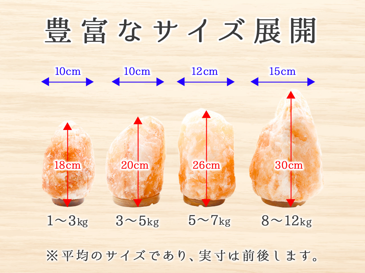大きさの目安が幅15cm・高さ30cmほどの岩塩ランプが『8~12kg』になります。